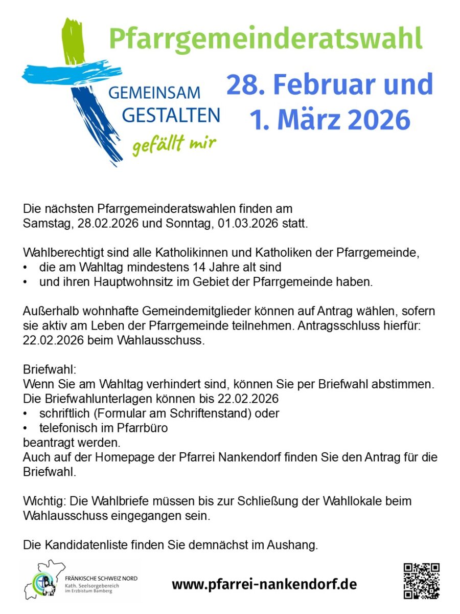 Außerhalb wohnhafte Gemeindemitglieder können auf Antrag wählen, sofern sie aktiv am Leben der Pfarrgemeinde teilnehmen. Antragsschluss hierfür: 22.02.2026 beim Wahlausschuss.